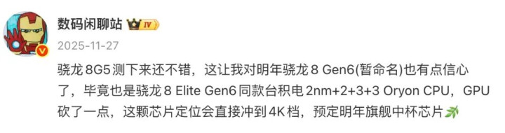 爆料中显示,“骁龙8G5测下来还不错,这让我对明年骁龙8 Gen6(暂命名)也有点信心了,毕竟也是骁龙8 Elite Gen6同款台积电2nm+2+3+3 Oryon CPU,GPU砍了一点,这颗芯片定位会直接冲到4K档,预定明年旗舰中杯芯片”。